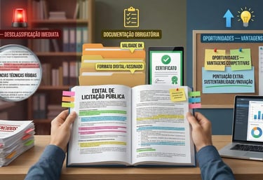 Realizo uma análise minuciosa do edital para identificar oportunidades estratégicas, exigências críticas e possíveis riscos, garantindo que sua empresa participe do processo licitatório com total segurança e preparação